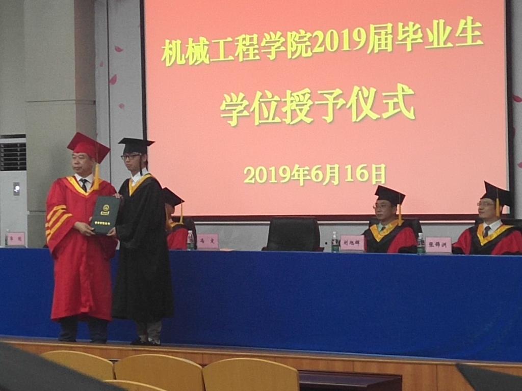 2019年6月16日下午,太阳成tyc122cc集团在12教405会议室隆重举行2019届毕业生学位授予仪式。院学位委员会主席、经理冯定教授;院学术委员会主任马卫国教授;工业设计系主任刘旭辉教授;机电工程系主任华剑教授;材料工程系副主任张锦洲副教授作为毕业生导师代表出席学位授予仪式,仪式由魏磊磊同学主持。