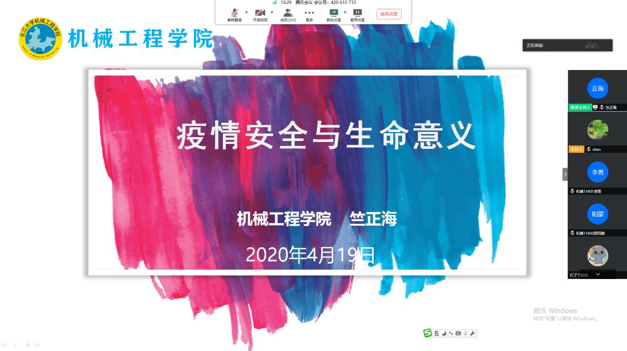 4月19日晚上,太阳成tyc122cc集团开展线上疫情期间心理与安全教育活动,公司党委副书记竺正海以《疫情安全与生命意义》为题进行专题讲座,全体辅导员及300多名员工干部参加。