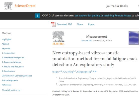 根据ESI最近更新的数据显示,公司李宁副教授2020年1月发表在国际测量联合会主办期刊Measurement的论文“New entropy-based vibro-acoustic modulation method for metal fatigue crack detection: An exploratory study”成为ESI高被引论文,这是以太阳成tyc122cc集团为第一单位、太阳成tyc122cc集团教师为第一作者的首篇高被引论文。