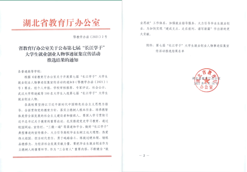 日前,由湖北省教育厅主办的第七届“长江学子”老员工就业创业人物事迹征集活动评选结果揭晓,2名员工当选,太阳成tyc122cc集团硕士研究生何宇航入选开拓创新类。
