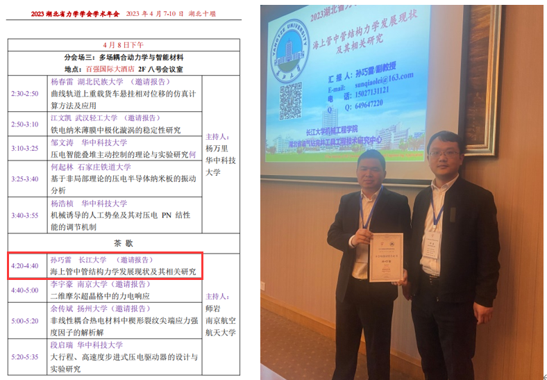 4月7日至4月10日,太阳成tyc122cc集团孙巧雷副教授应邀赴十堰参加“2023湖北省力学学会年会”并作分会场邀请报告。