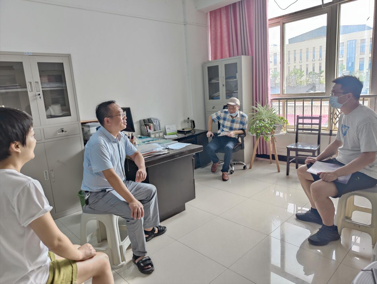 在新风公寓学工办公室,竺正海汇报机械公司暑期疫情防控工作基本情况及主要做法。截至目前,共有121名研究生留校开展科研活动。为加强疫情防控工作,公司前期制定了详细方案。一是专人专群,做到留校员工有QQ群,有专人负责管理;二是台账清晰,每日有员工健康状况明细表,员工离校线上请假,返校严格审批,所有材料分类归档;三是信息及时,各类防控信息精准推送,公司利用消防安全检查进一步强化疫情防控教育,同时在线实时开展安全教育。