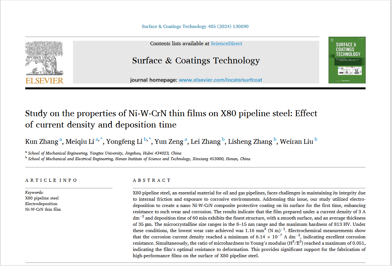 2024年6月,由Elsevier主办的权威外文T1级学术期刊Surface and Coatings Technology、T2级学术期刊Colloids and Surfaces A: Physicochemical and Engineering Aspects、T3级学术期刊Materials Today Communications先后刊发了公司李美求教授团队关于油气管道X80管线钢表面涂层的最新研究成果,公司博士研究生张昆为论文第一作者,李美求教授为论文的通讯作者。