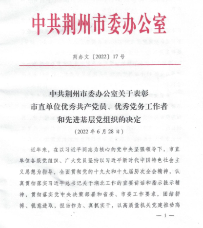 “七一”前夕,中共荆州市委办公室下文表彰优秀共产党员、优秀党务工作者、先进基层党组织,公司党委获批荆州市市直单位“先进基层党组织”称号。