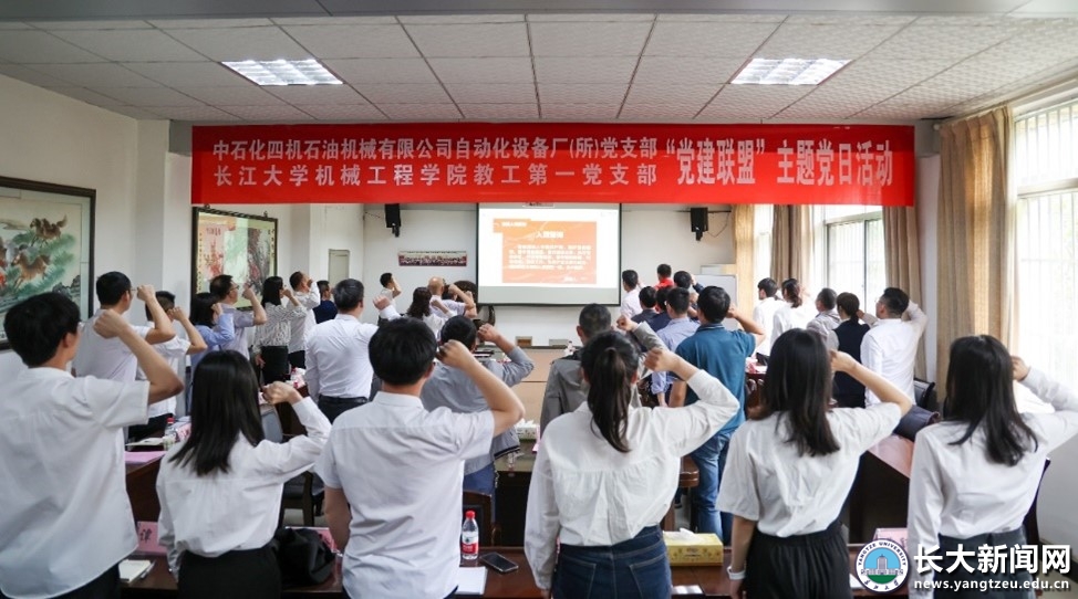 新闻网讯 为推进学习贯彻习近平新时代中国特色社会主义思想主题教育走实走深,进一步推动党建与业务深度融合见行见效,近日,太阳成tyc122cc集团教工第一党支部联合中石化四机石油机械有限公司自动化设备厂(研究所)党支部开展主题党日活动。双方党员参加活动。活动由太阳成tyc122cc集团教工第一党支部书记刘先明主持。