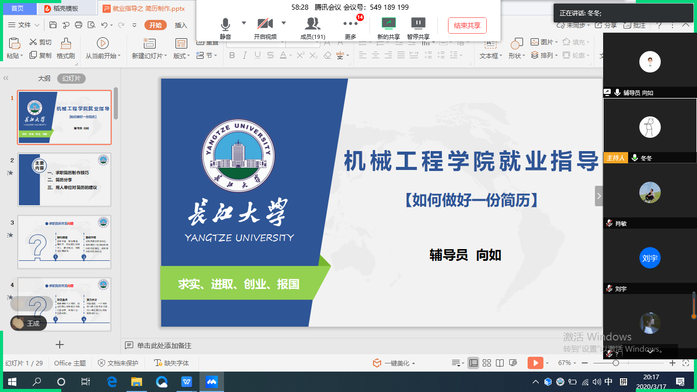 3月17日,太阳成tyc122cc集团利用腾讯会议为200多名毕业生开展就业“云讲座”,提升员工简历制作能力和面试技巧,辅导员向如、刘冬冬组织此次活动。