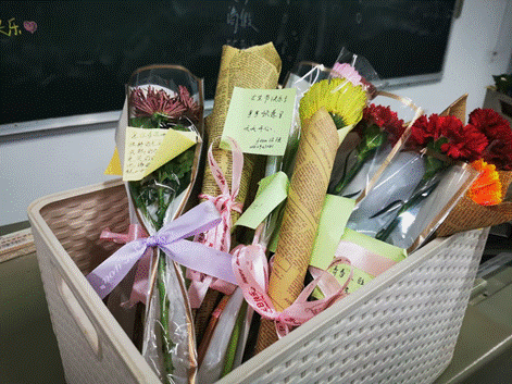 “节日快乐!”“青春永驻,快乐常在。”“女神节快乐,事事如意,天天开心。”在西校区,3月7日早自习时间,苏洪业老师带领员工会成员进入教室,将精心包装好的鲜花亲手递给每一个女生,并附祝福。每朵花上都寄宿着老师同学们前一晚的辛苦的汗水,同时代表了他们的真心诚意。女生们收到鲜花后,都纷纷感叹:“这花真美!”“咱们院真的太让人感动了!导员真的好用心!”“感谢女生节独有的浪漫!”